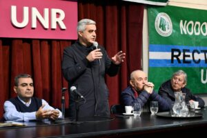 Por su parte, el Secretario General de APUR, Miguel Roldán, subrayó la importancia de la unidad de todos los sectores universitarios: “Esta es la lucha. ¿Es la vida o es el fin de lo que hasta ahora fue la historia argentina? No hay margen para excusas ni disputas menores: la defensa de la universidad pública requiere que todos estemos a tope—rectores, trabajadores docentes y Nodocentes, y estudiantes—porque si caemos, caemos todos.