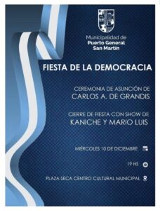 La Municipalidad de Puerto General San Martín celebrará este miércoles 10 de diciembre la Fiesta de la Democracia, en el marco de la ceremonia de asunción de Carlos A. De Grandis, uno de los dirigentes con mayor trayectoria política de la región.
