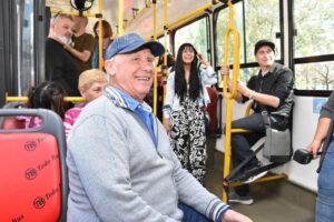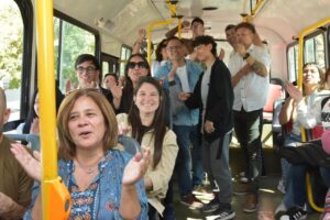 “Quiero destacar la fuerza de estos dos empresarios que vuelven a intentar en Puerto hacer un recorrido local, y para eso necesitamos que los vecinos lo utilicen. No solamente los chicos de las escuelas. Queremos que sea esta vez con éxito”, expresó el Intendente quien se subió a una de las unidades para compartir un grato momento con los chicos en un exultante primer viaje inaugural.