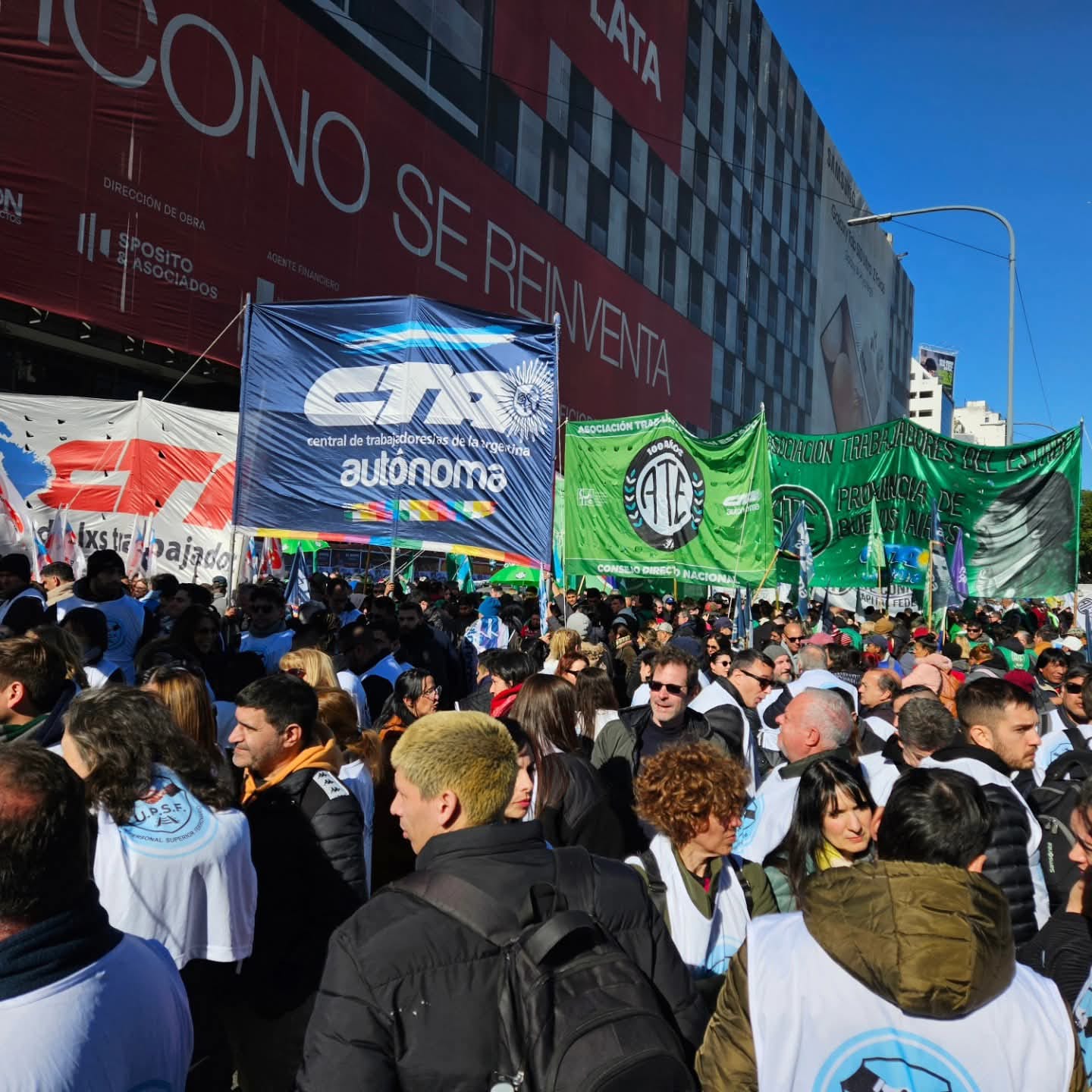 La jornada de protesta comenzó a las 12h cuando los trabajadores y trabajadores de distintos sectores concentraron en Carlos Pellegrini y Sarmiento, para luego dirigirse a la sede del Ministerio de Desregulación ubicado en Avenida Presidente Roque Sáenz Peña 788.