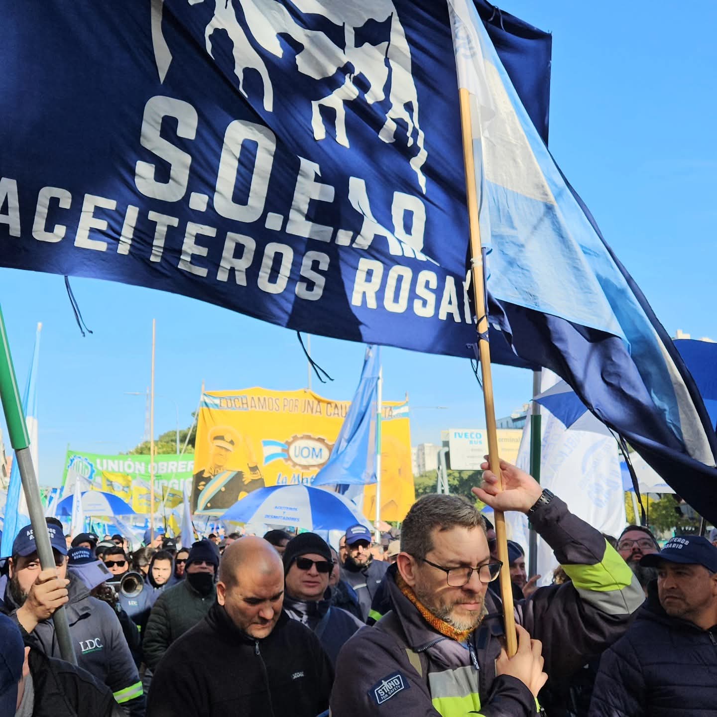 Obreros y Empleados aceiteros de Rosario estuvieron presentes encabezados por su secretario general Marco Pozzi. En sintonía con la Federación de trabajadoras y trabajadores Aceiteros y Desmotadores de Algodón (FTCIODyARA), el SOEAR alzó el reclamo por «las políticas del Gobierno Nacional que fijan límites a la negociación paritaria, atacan y desregulan el sistema productivo y del transporte y recortan en áreas estratégicas como la educación, la ciencia, la salud y la infraestructura». Además, se pronunciaron contra los despidos, la represión y la criminalización de la protesta. «Para defender todo lo conquistado, honrando también a quienes nos precedieron en la lucha. Por nuestro presente y nuestro futuro» expresaron desde el sindicato rosarino.