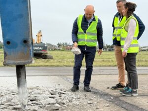 “Hoy empezamos con la demolición total de la cabecera, que se va a ampliar para permitir un viraje mucho mayor. Y en la parte central, se demuelen las losas, y usando la base de hormigón, se reconstruye con tres capas de asfalto modificado, diseñado para pistas aeroportuarias”, indicó Alvarado. En paralelo, se realizará la obra de instalación del sistema de balizamiento “que va a permitir ampliar la capacidad operativa del aeropuerto con condiciones climáticas adversas”.