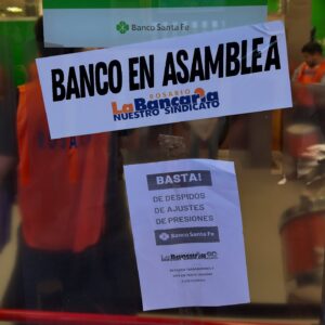 Pero hoy estamos acá en la puerta del banco de Santa Fe. Venimos denunciando al banco por presionar a retiros voluntarios a sus trabajadores y trabajadoras que terminan, de alguna manera, el día lunes con despido sin causa y telegrama de despido.