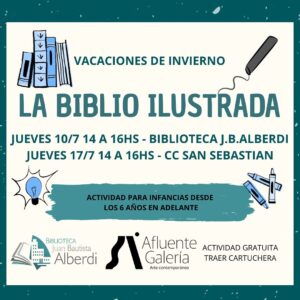 Este invierno llega “La Biblio Ilustrada”, una propuesta creativa para niñas y niños desde los 6 años. Una actividad llena de arte, libros y expresión. Organizando por la Biblioteca Juan Bautista Alberdi y Afluente Galería.