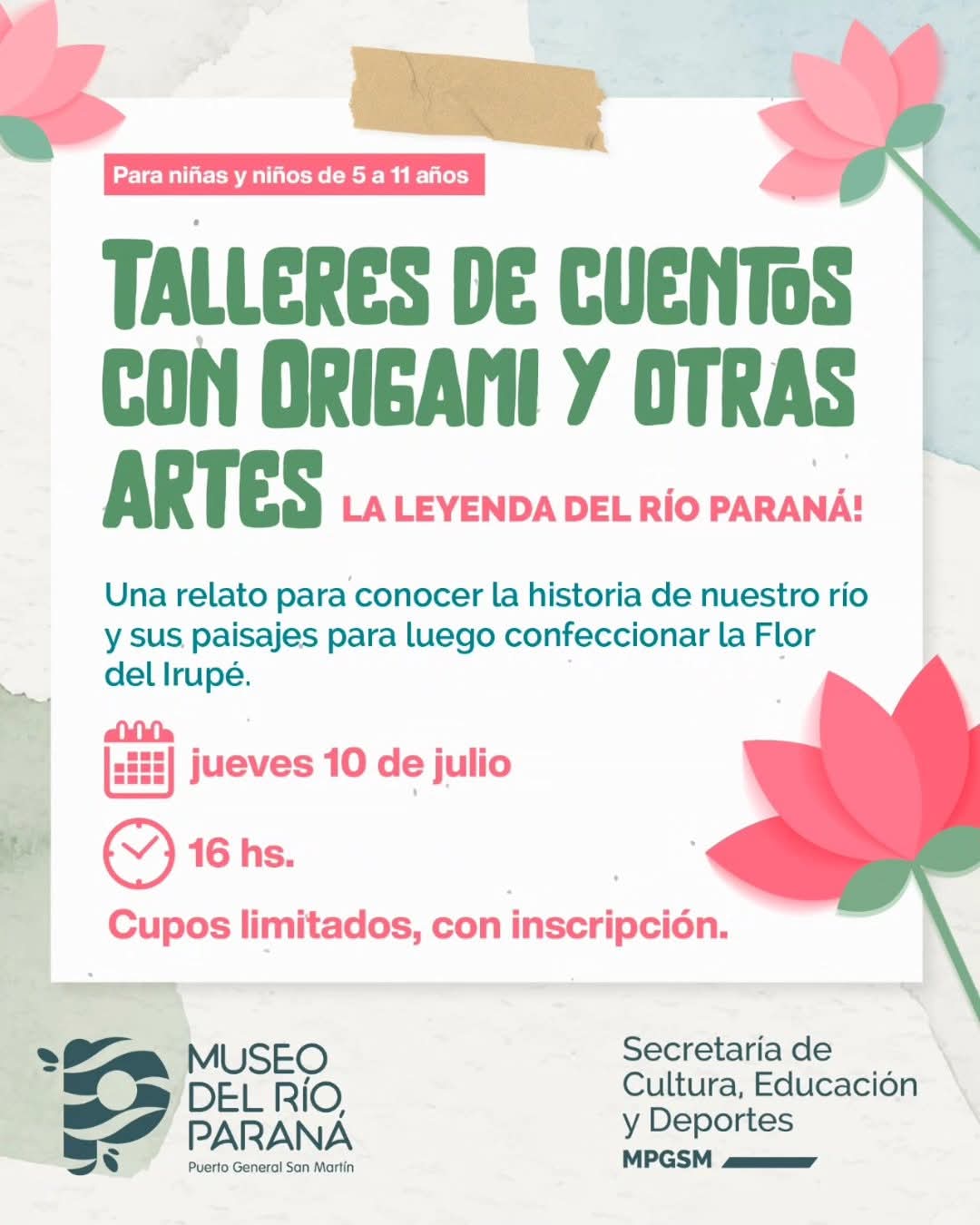 El jueves 10 de julio, la propuesta es de la Biblioteca J.B. Alberdi con “La Biblio Ilustrada” para infancias desde los 6 años de edad, y del Museo con “Taller de Cuentos con Origami y otras artes” un relato para conocer la historia del río Paraná y sus paisajes para luego confeccionar la flor del Irupé. También habrá cine en el auditorio del CCM con la proyección de “Minecraft”.