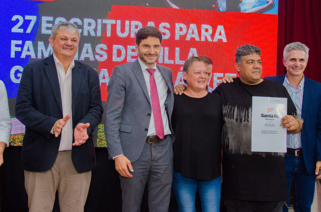 Durante el acto, 27 familias de Villa Gobernador Gálvez recibieron las escrituras de sus viviendas. A través de la política pública de escrituración gratuita de viviendas sociales, el Gobierno provincial busca brindar soluciones habitacionales y mejorar la calidad de vida de los adjudicatarios, otorgando seguridad jurídica a los beneficiarios y sus familias.